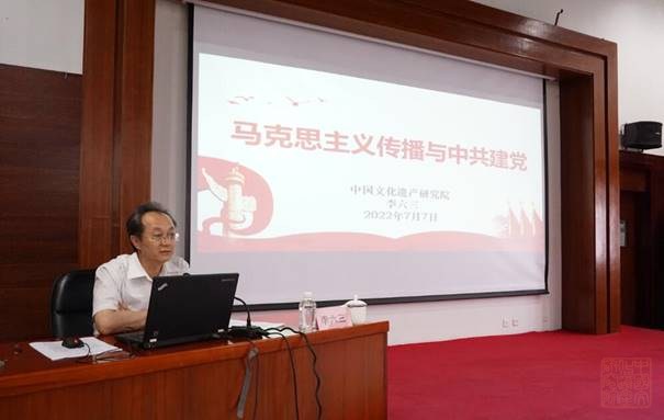 7月7日下午,中国文化遗产研究院院长、党委书记李六三以“马克思主义传播与中共建党”为主题讲授专题党课。副院长许言出席,各党支部成员及党小组长、副总工程师、部门(机构)正副职、入党积极分子、党员发展对象现场听课,其余党员、干部职工分部门通过会议视频系统线上听课。 专题党课从“感悟马克思主义真理的力量、马克思主义在中国的传播、中国共产党秘密成立”三个方面展开,用大量文献资料和重大历史人物及事件,全面阐述了马克思主义的“三大来源”、“三大特征”和“三大组成”,《共产党宣言》的核心、马克思主义认识和改造世界的基本方法、马克思主义在国际国内传播的时代背景,以及在中国的早期传播者与传播阵地、中国共产党的秘密成立过程。 李六三指出,顺应人类社会发展规律的学说才是科学的理论,指导实践获得成功的科学理论才是真理,真理的力量可以突破国界传遍世界改变世界;只有先进的知识分子、爱国人士才能准确判断真理的到来,并积极传播真理和唤醒民众去践行真理;传播和践行真理是有风险的,是需要牺牲精神的,是需要信仰的支撑和同志的支持的;革命事业需要有组织保证,组织首先要明确自己的阶级基础,须明确自己的目标和使命,且要有严格的规章和严密纪律;代表大多数民众利益的组织才是强大的,代表进步文化的组织才是有前途的,代表人类社会发展方向的组织才会获得最终胜利;中国共产党成立之初就汇聚了最优秀的仁人志士,掌握了马列主义真理,扎根于劳苦大众之中,以发动和解放劳苦大众为己任,以谋求中华民族独立自由解放和伟大复兴为使命,必将为中华民族的独立、解放和复兴带来曙光;习近平新时代中国特色社会主义思想与马克思主义一脉相承,是21世纪的马克思主义,是指导中国人民奋进新时代、实现中华民族伟大复兴的强大思想武器和行动指南。 李六三要求,中国文化遗产研究院、全体党员和干部职工要持续深入学习贯彻习近平总书记关于文物工作的重要讲话和指示批示精神,贯彻新发展理念,运用马克思主义唯物、实践、联系、发展等观点全面梳理重点工作,坚持开门建院,积极吸引优秀人才为院所用;要居安思危,敢于担当,努力工作,尽业奉献,加快推进国家文化遗产科技创新中心建设、机构设置调整、人员编制落实、人才队伍建设、重大项目(课题)及重点工作任务实施,为院深化改革和全面高质量发展作出新的贡献,以实际行动迎接党的二十大胜利召开。