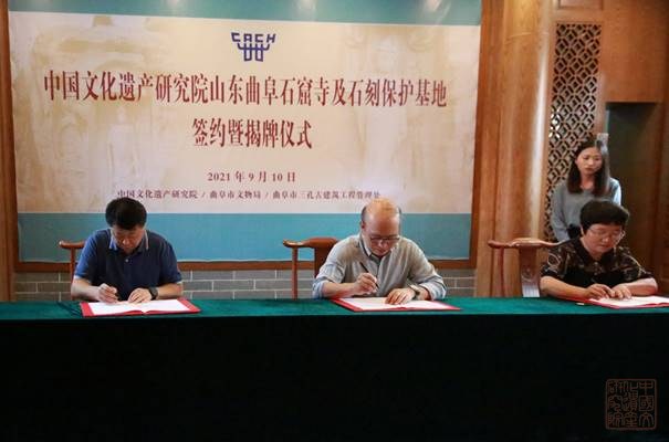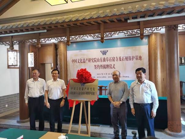 为深入推动山东省以及曲阜市文化遗产的?;び肟沙中⒄?,曲阜市文物局、三孔古建筑工程管理处与我院签订合作协议并设立中国文化遗产研究院曲阜石窟寺及石刻?;せ亍?月10日上午,中国文化遗产研究院曲阜石窟寺及石刻保护基地正式揭牌,同时签署了合作协议。 中国文化遗产研究院院长柴晓明、山东省文化和旅游厅副厅长、省文物局副局长王廷琦,济宁市委常委、宣传部部长任庆虎,山东省文化和旅游厅文物?;び肟脊糯Ω贝Τだ加窀唬媚形幕吐糜尉?、文物局局长张弢,曲阜市市长崔加清,曲阜市文物局局长刘爱春等相关领导出席揭牌仪式。柴晓明、王廷琦、任庆虎、崔加清共同为“中国文化遗产研究院山东曲阜石窟寺及石刻?;せ亍苯遗??;疃殖?,柴晓明、刘爱春和孔祥民分别代表中国文化遗产研究院、曲阜市文物局、曲阜市三孔古建筑工程管理处共同签署合作协议。 王廷琦副厅长指出,山东省石窟寺数量众多,内容丰富,形式多样,地方特色鲜明,是华东地区第一石窟大省。曲阜是儒家文化的发源地、孔子故里,文化遗产丰厚。希望基地能够强化人才培养,扎实推进工作,为山东省石窟寺保护利用工作做出贡献。柴晓明院长强调,近年来,文研院在国家文物局、山东省文物局的领导支持下,与曲阜市文物局等兄弟单位多年紧密合作,成果丰硕?;氐慕ǔ墒俏袷岛献鞯某晒?,必将为推动曲阜和山东省文化遗产?;ぷ呱钭呤?、共同推进文化遗产保护发挥重要作用。